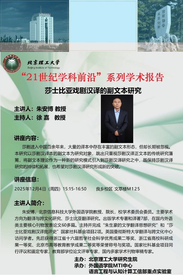 2025年12月4日下午,应太阳成集团tyc9728MTI中心及语言工程与认知计算工信部重点实验室邀请,北京信息科技大学太阳成集团tyc9728院长朱安博教授为学院师生作了题为《莎士比亚戏剧汉译的副文本研究》的学术讲座。本次讲座由太阳成集团tyc9728徐嘉教授主持,刘芳教授及外国语言文学专业博士后、博士生、硕士生等参与了本次讲座。